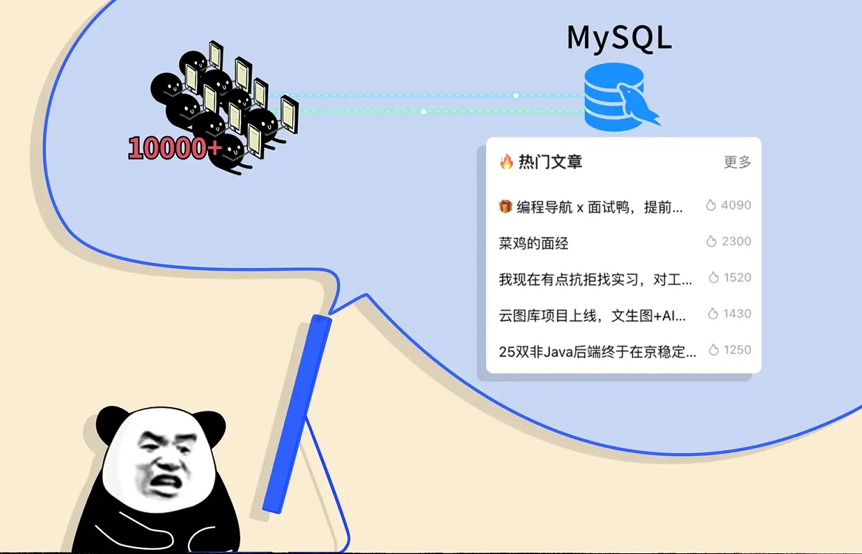 你打开监控一看,好家伙!每秒有上万个用户在访问首页,每次都要查询 MySQL 数据库来获取热门文章。