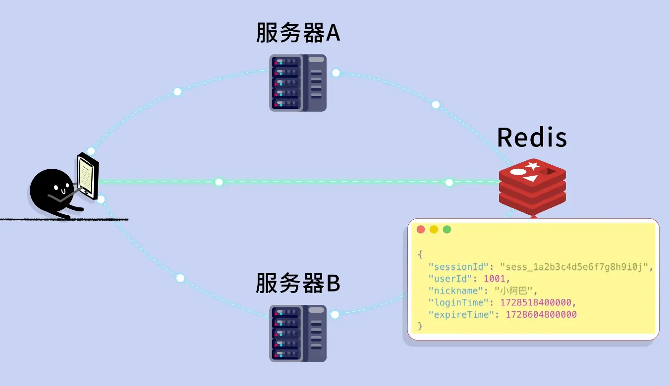你想了想:Redis 的本质是 存储系统,也就是说,可以利用 Redis 来存储多个服务器间需要共享的数据。公司有 2 台服务器,用户第一次登录时,Session 存在服务器 A 本地;刷新页面后,请求被分配到服务器 B,就找不到 Session 了,导致丢失登录态。那我就把需要共享的 Session 数据存到 Redis 中,这样无论请求分配到哪台服务器,都能从 Redis 里拿到 Session。