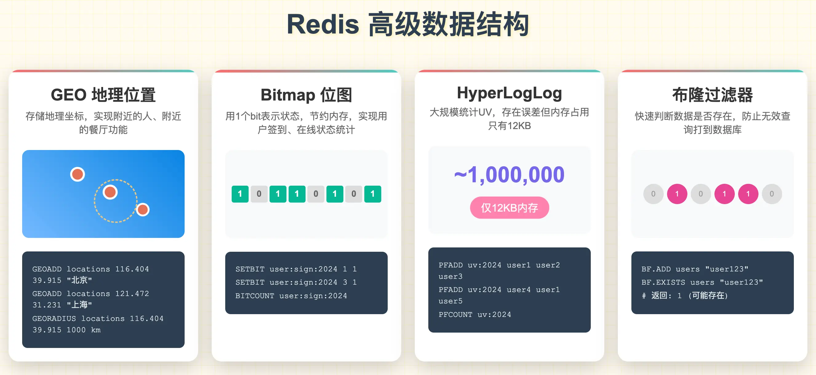- HyperLogLog:适用于大规模统计 UV(独立访客数),虽然存在误差,但内存占用只有 12 KB