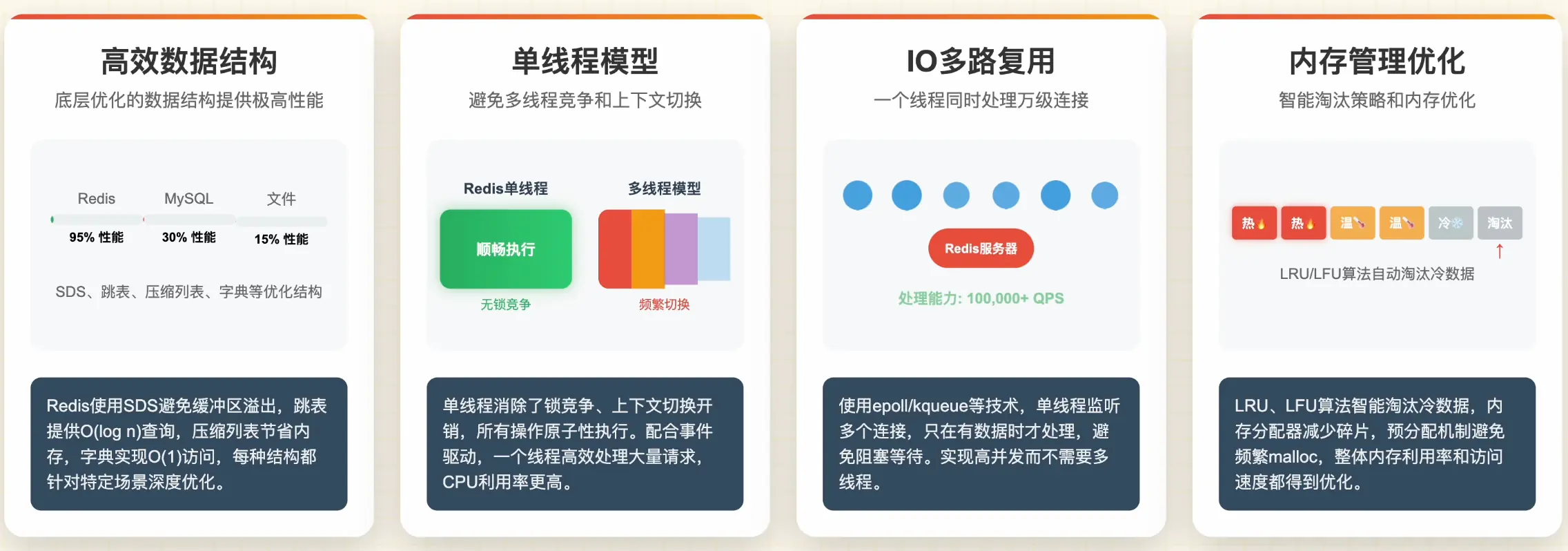 - 高效的数据结构:Redis 底层使用了动态字符串、跳表、压缩列表等经过优化的数据结构