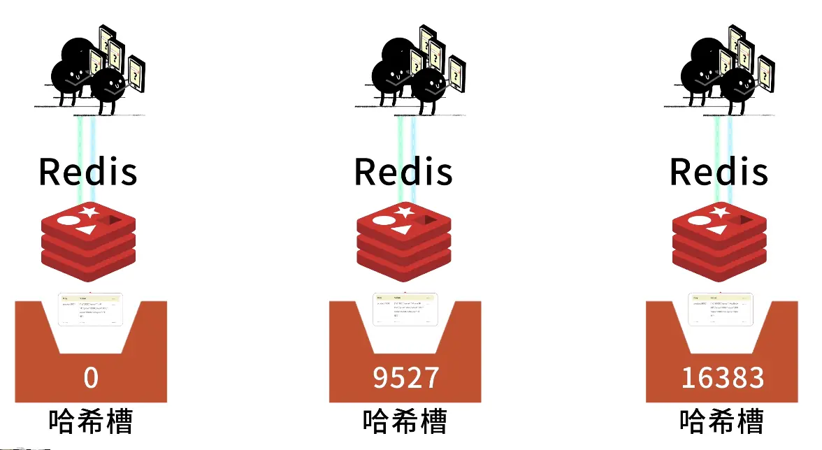 还可以搭建 分片集群 ,把数据按照某种规则分散到多台 Redis 上,每台只存一部分。Redis 使用 哈希槽 机制来分配数据,既能存储更多数据,又能承受更高并发。