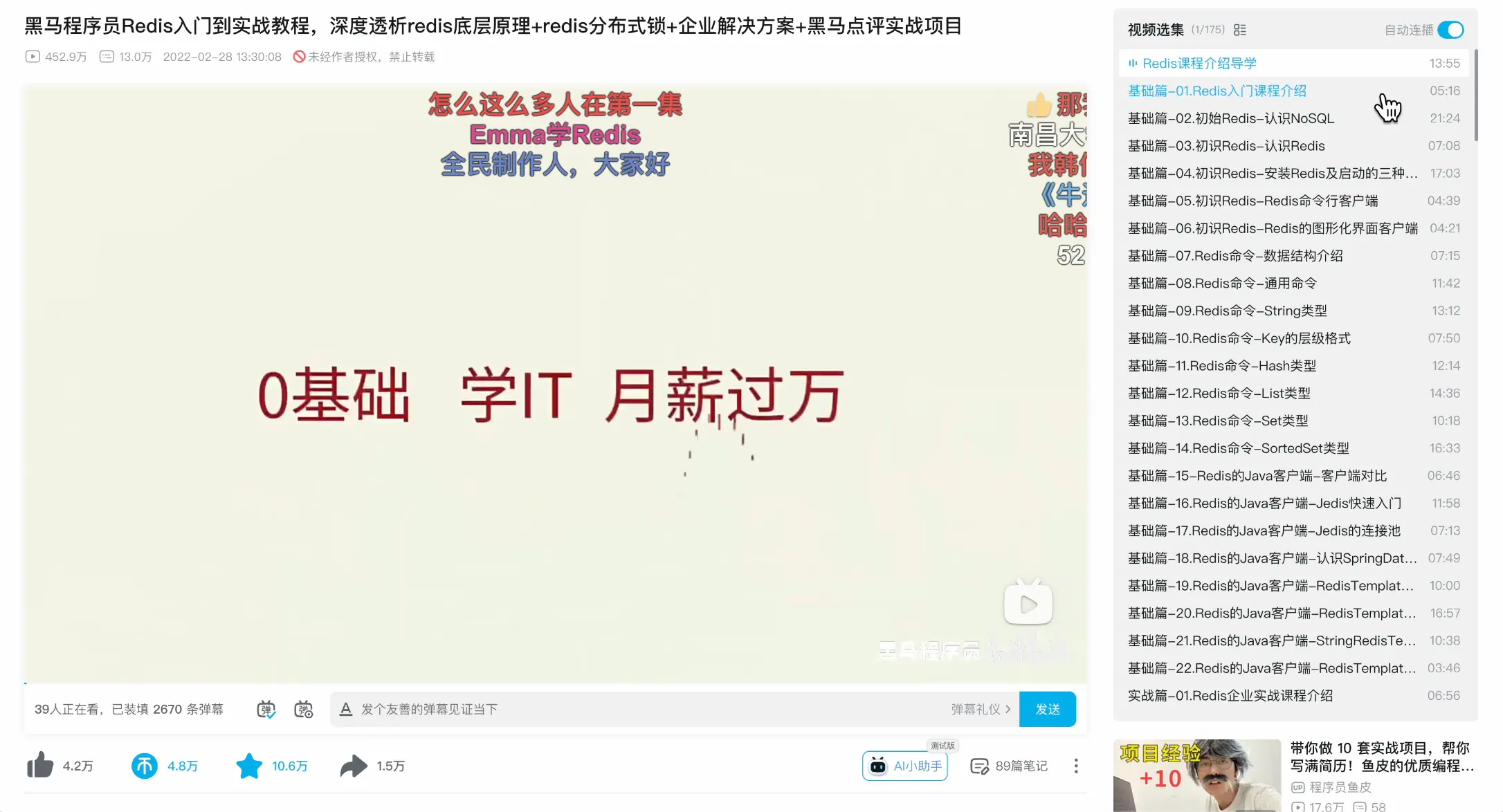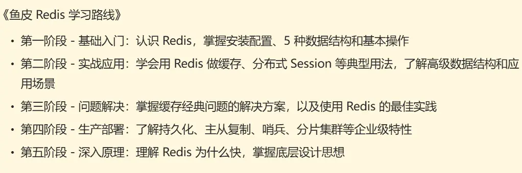 时间充足的话,建议你看看某马的 Redis 教程来系统学习,我当年也看过,讲的很好,先把基础篇和实战篇看完就够了。