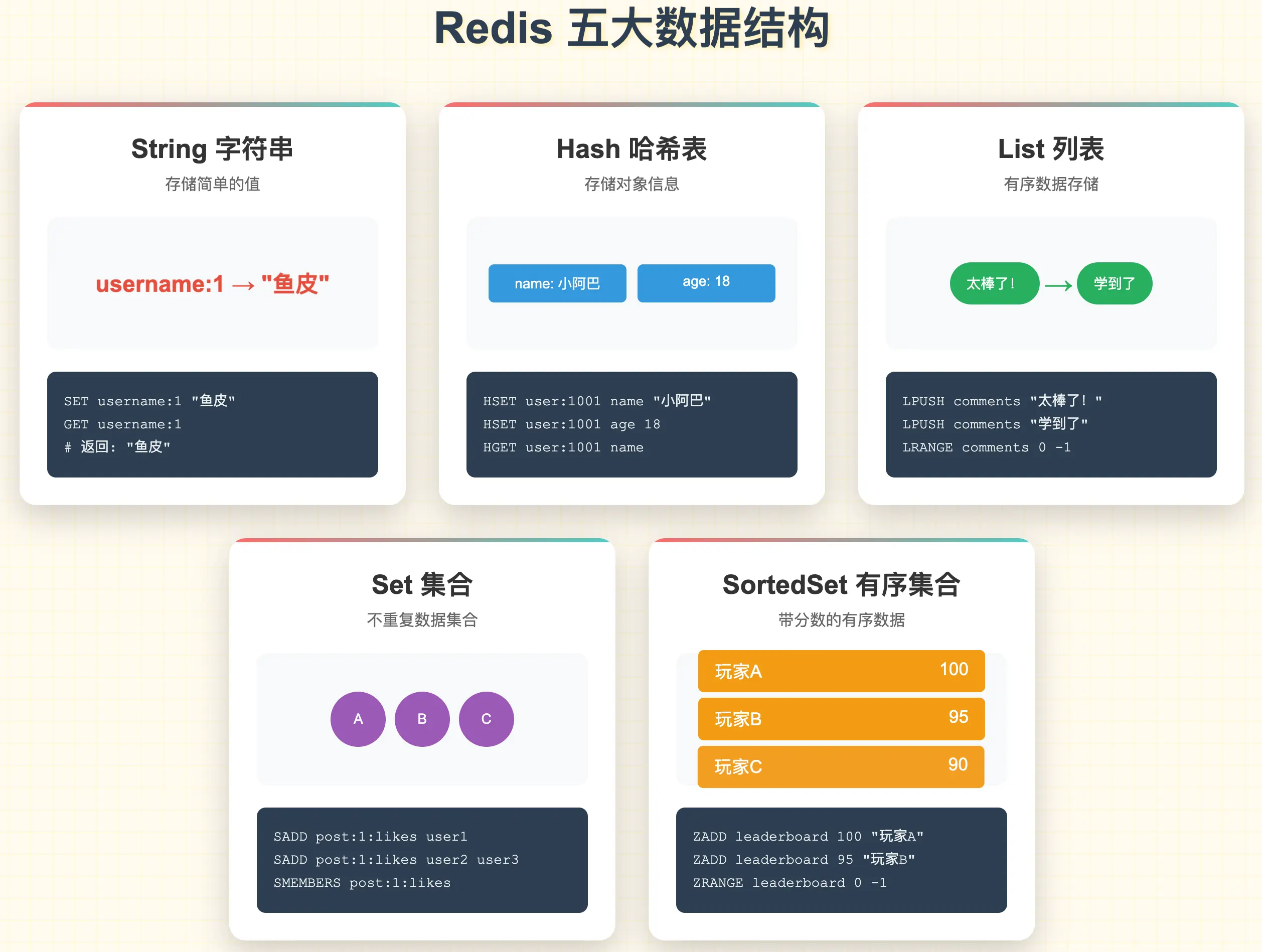鱼皮:当然,Redis 能存的东西可多着呢~ 它有 5 种基本数据结构,适用于不同场景: