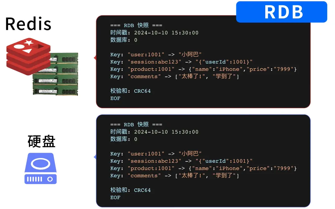 1)RDB 快照:定期把内存数据完整保存到硬盘,像拍照一样,恢复快但可能丢失最新数据。