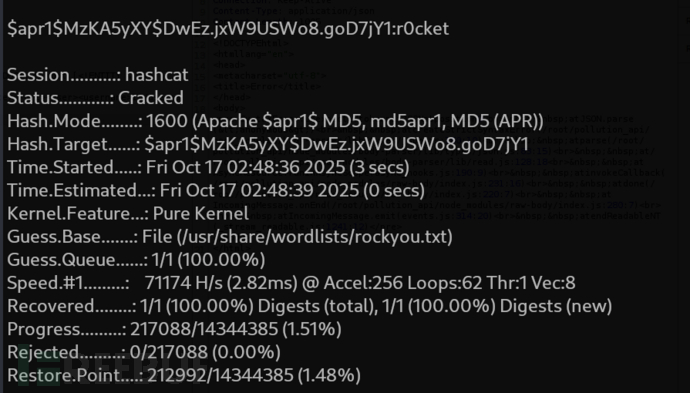 $ hashcat -a 0 hash /usr/share/wordlists/rockyou.txt --user