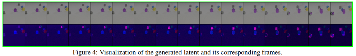 图 4:不同消融设置下的 latent 特征可视化与对应生成视频帧对比