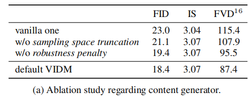 - 结论:移除 "采样空间截断" 或 "鲁棒性惩罚" 会导致 FID 升高、FVD 升高,证明两项优化均能提升内容生成质量,且共同作用时效果最优。