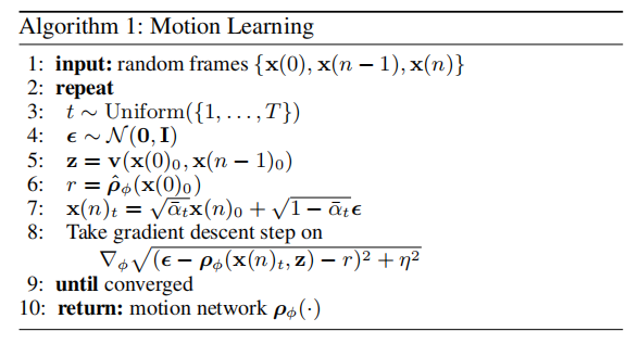 VIDM 的视频生成过程分为训练 与推理两个阶段,核心流程由算法 1(运动学习)与算法 2(视频生成)定义: