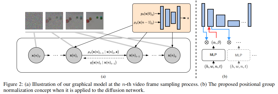 图 2:(a)第 n 帧采样过程的图形模型;(b)位置组归一化(PosGN)在扩散网络中的应用示意图