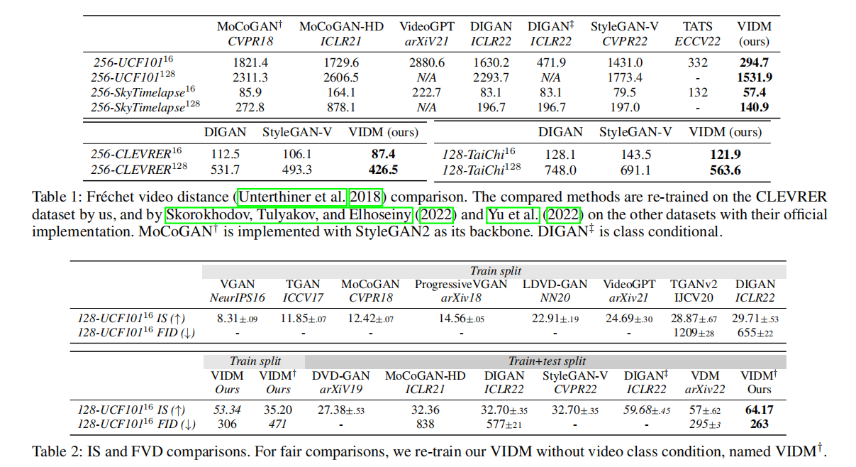 论文通过表 1 与表 2 展示了 VIDM 与基线方法的 FVD、IS、FID 对比,核心结论如下: