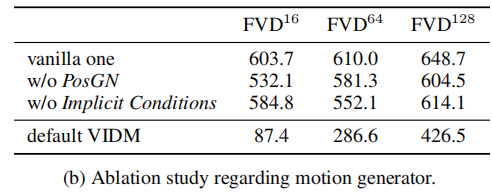 - 移除 PosGN 或隐式运动条件,FVD 显著升高,尤其在长视频(64 帧、128 帧)中,证明两项组件对运动连续性至关重要;
