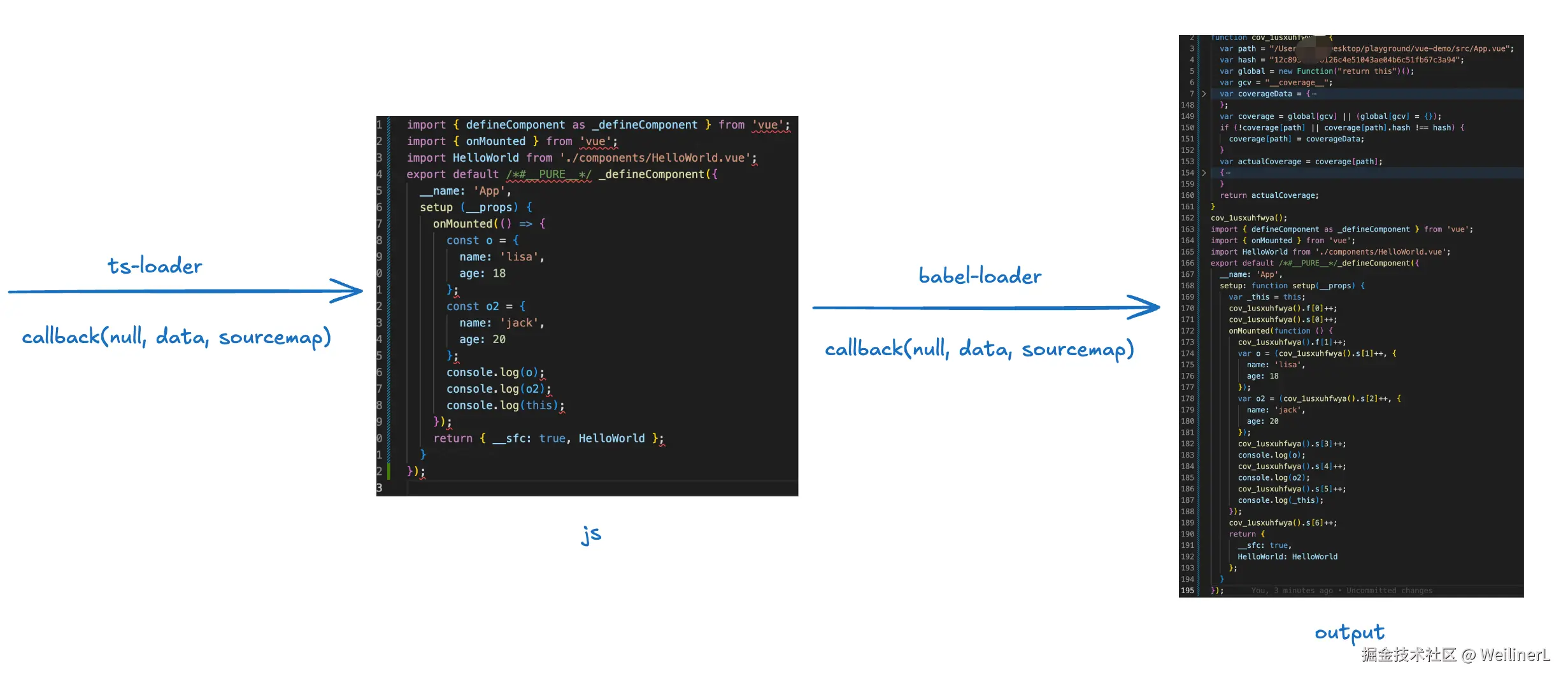 以Webpack构建为例,这种插桩方式实际上是基于构建后的代码来插桩的,由于babel处理代码往往是最后一步,因此babel拿到的代码是经过各种loader处理后的非原始代码 。他的插桩行列号采集的是编译后的代码的行列号: