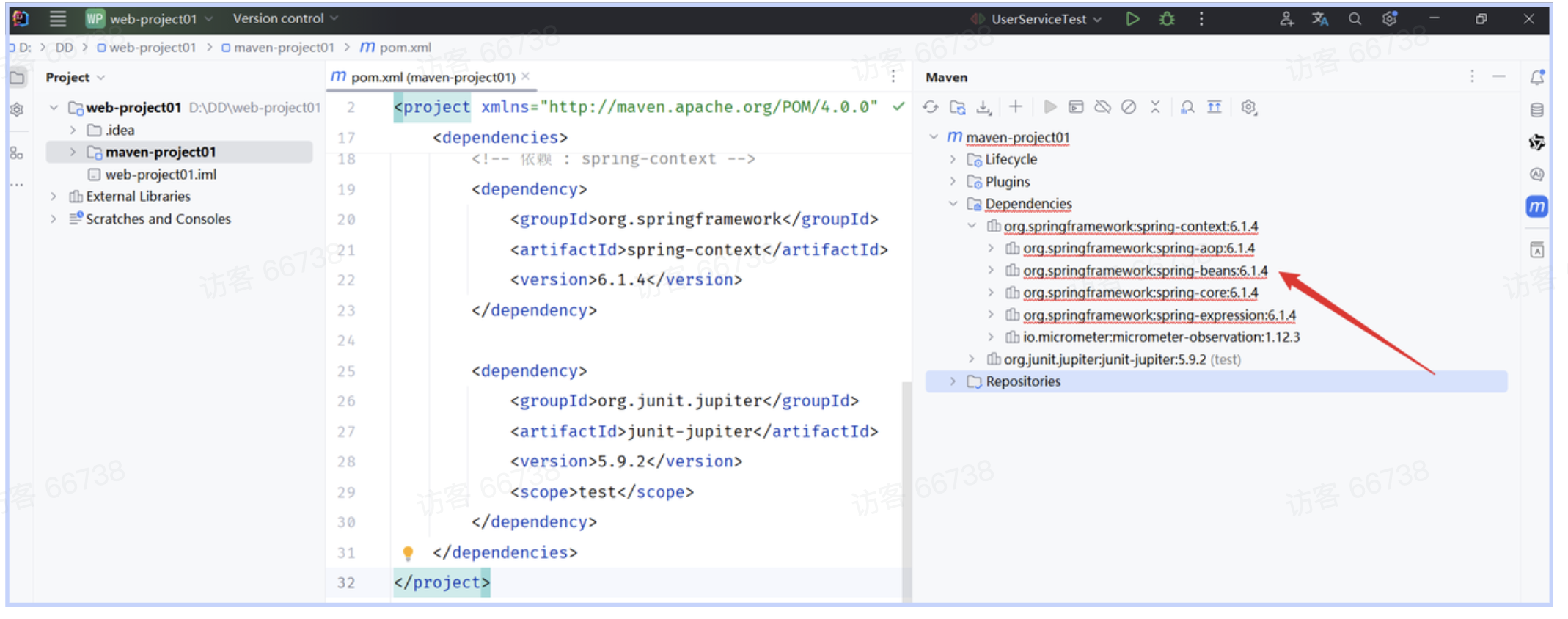 如上图所示,给junit依赖通过scope标签指定依赖的作用范围。 那么这个依赖就只能作用在测试环境,其他环境下不能使用。