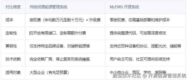 很多人会问:"商业闭源系统更稳定,为什么要选 MyEMS?" 其实,两者的差异不止 "成本",更在于 "主动权"。我们可以通过一组对比,看清 MyEMS 的优势: