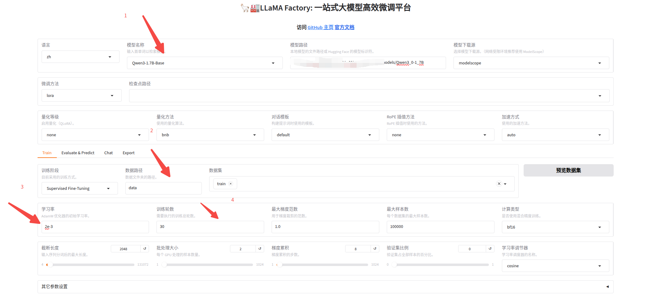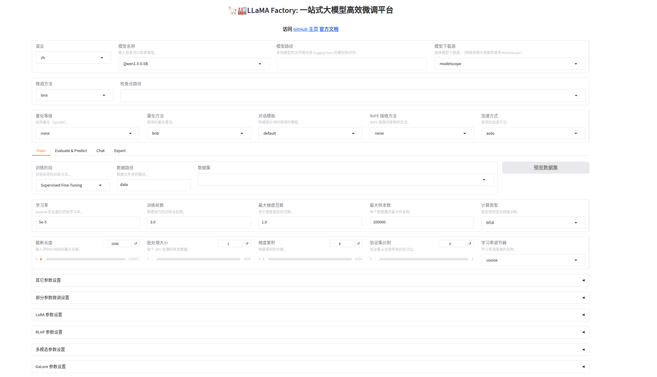 优势:配置简单,支持多轮对话数据格式,内置常见数据集(如 Alpaca、ShareGPT 等),可直接对接 Hugging Face 模型和数据集,支持模型评估和部署导出,自定义超参数,界面支持中文、英文等多种语言;