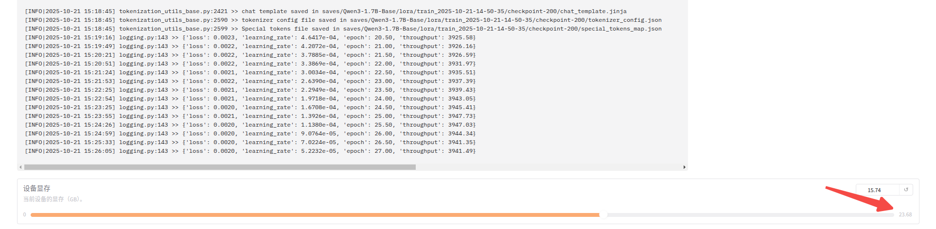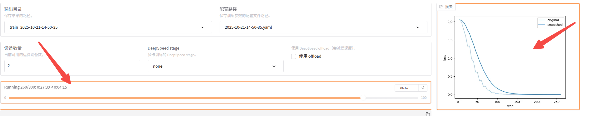 1、ui界面上可以看到实时的训练进度以及loss曲线,也可以在底部看到log日志以及显存使用量;