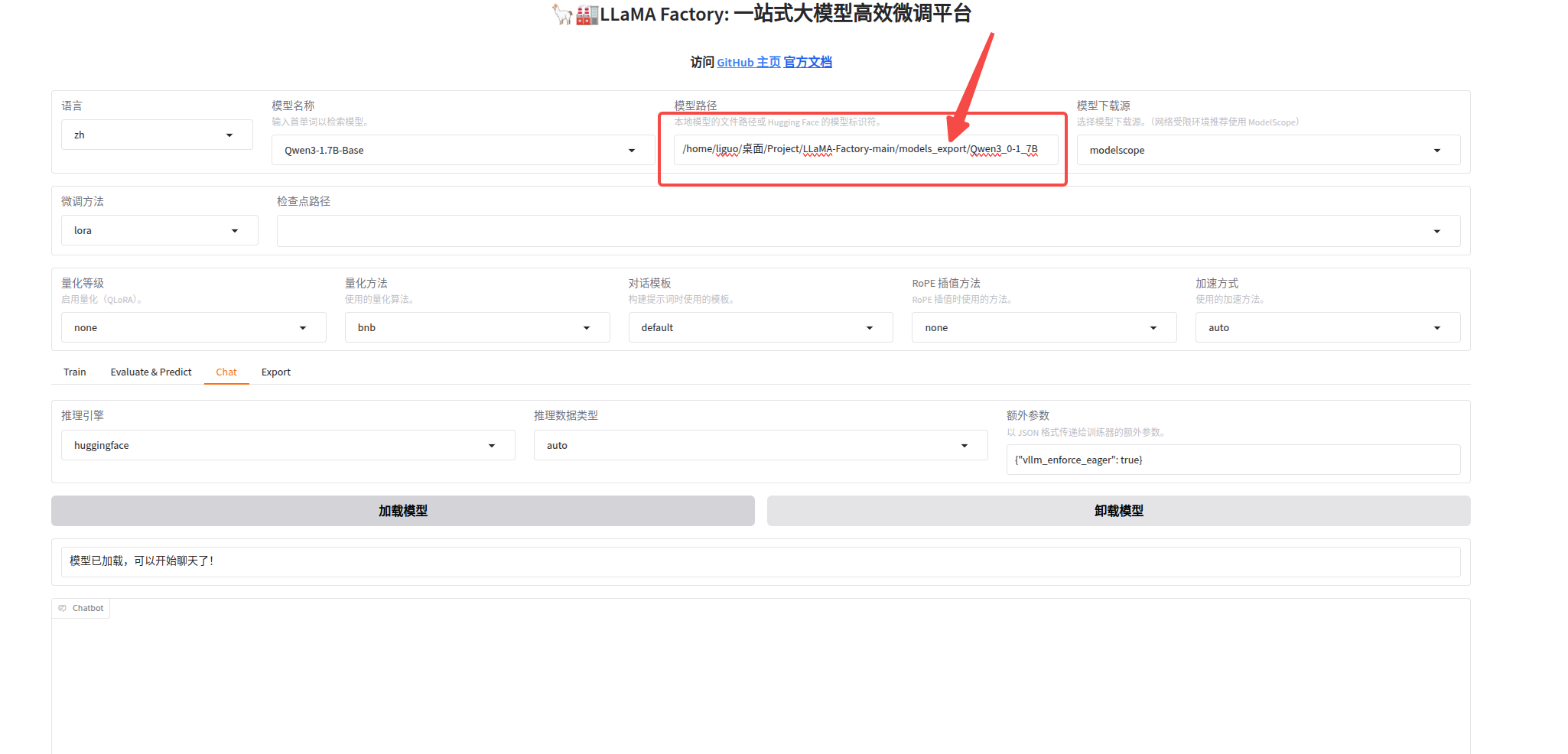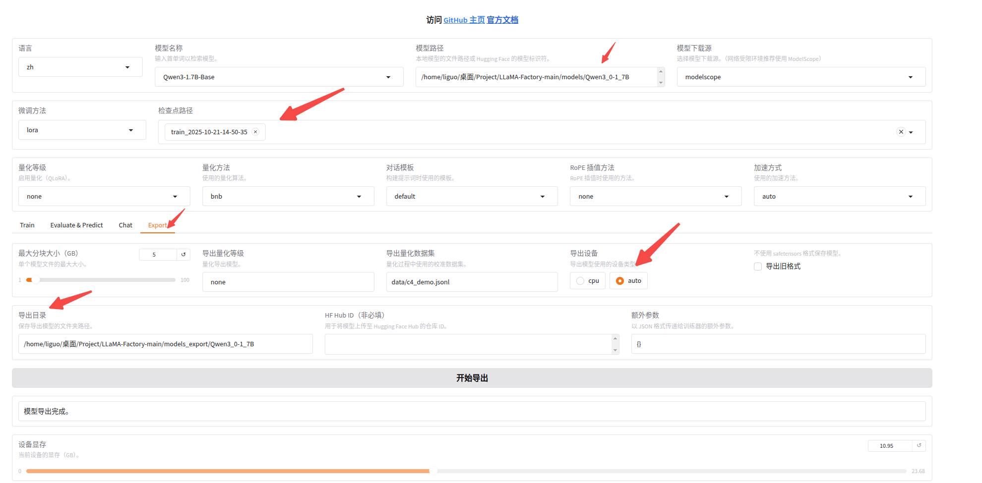 按照下图选择原始模型路径以及检查点路径,可导出微调后的模型;之后在部署时,可直接使用导出后的模型,即为微调后的模型