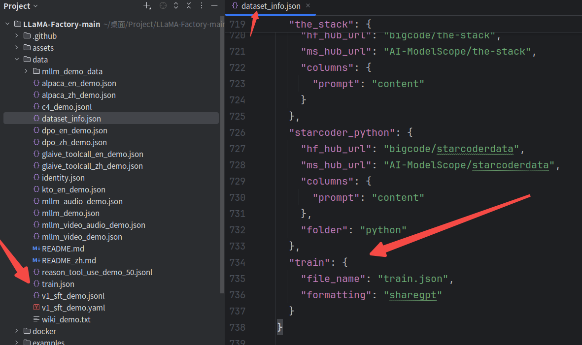 将其中的train.json复制到本地LLaMA Factory中的data路径下,同时,修改dataset_info.json,在底部增加train训练集;在回到ui界面就能看到train训练集的选项了;