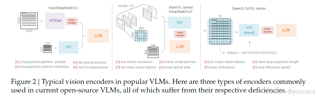 图 2 | 流行 VLM 中典型的视觉编码器。这里介绍了三种常用的主题编码器,所有这些编码器都各自存在缺陷。