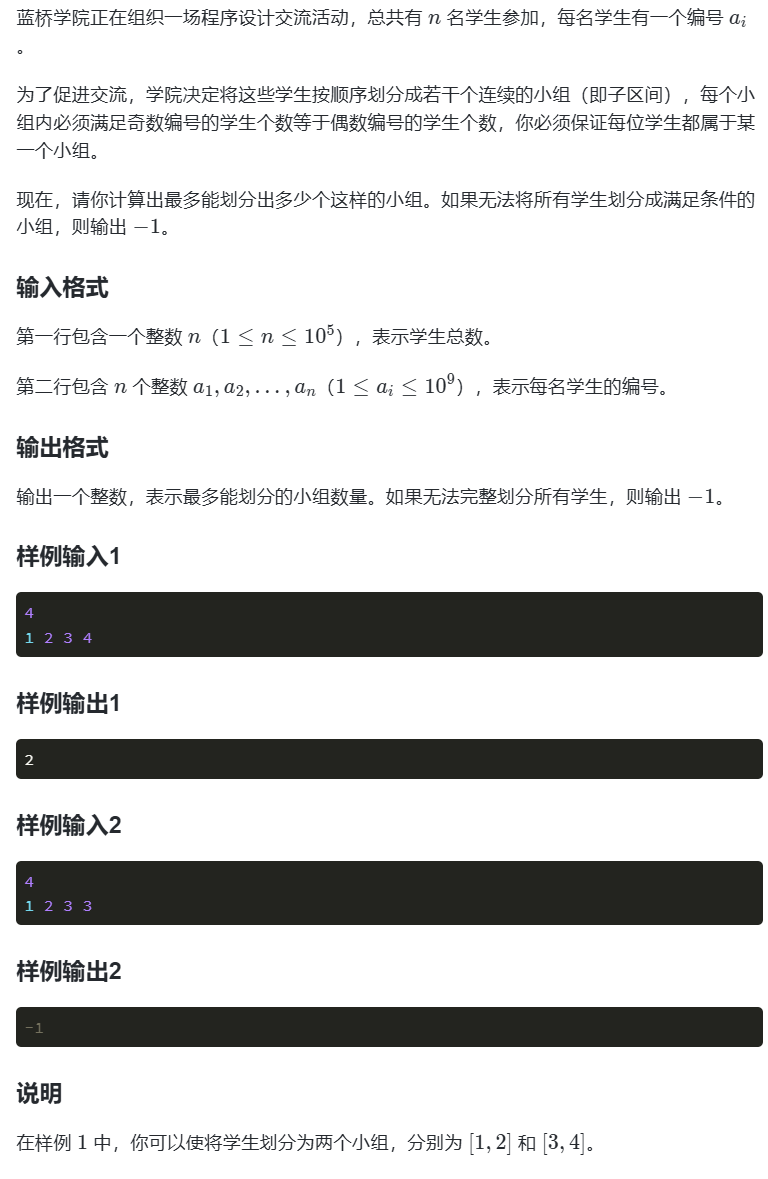 (2)划分最多的子区间:我们可以使用贪心,从 i=1 到 n 遍历当奇偶数量一致时就划分为一个子区间说明从上⼀个切割点到当前 i 形成了⼀个最短的平衡⼦数组。