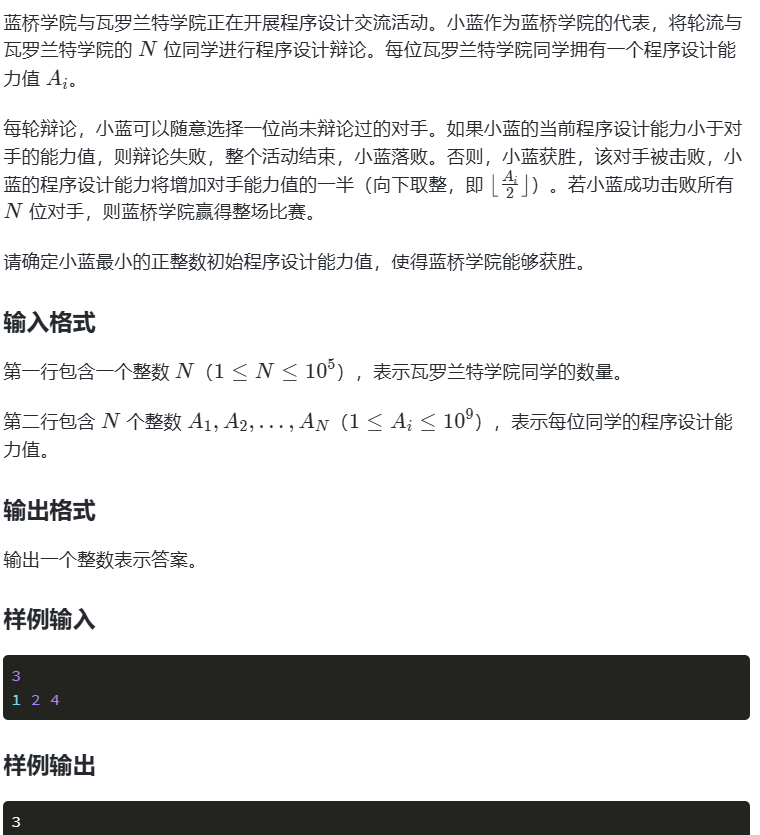 首先:这道题要求获胜的小蓝最小的正整数初始程序设计能力值 ,最佳策略:优先与能力值最小的对手辩论故要排序