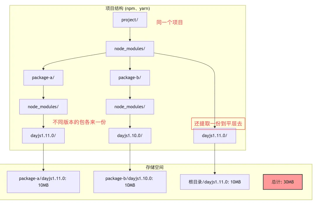 - 重复安装问题:同一个项目安装一个包的不同版本时,会复制多份;在不同项目中安装相同依赖时,会完整复制整个依赖包到项目目录。