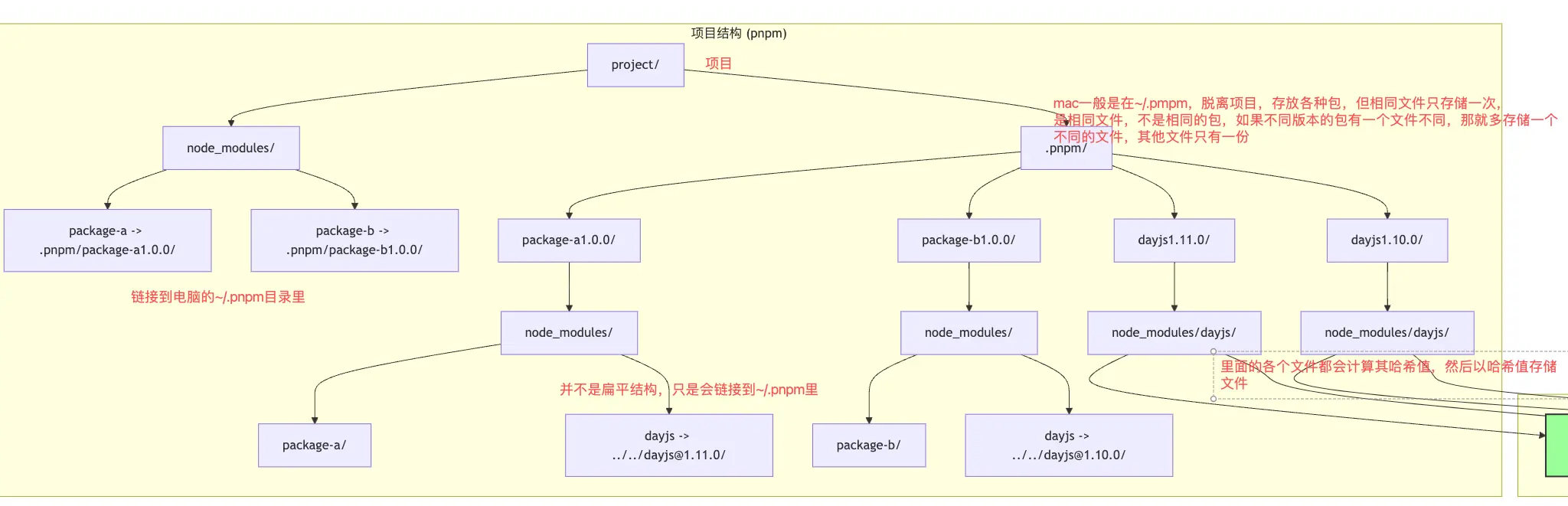- 硬链接技术:项目中的依赖文件通过硬链接指向全局存储,所以相同文件不会占用额外磁盘空间。