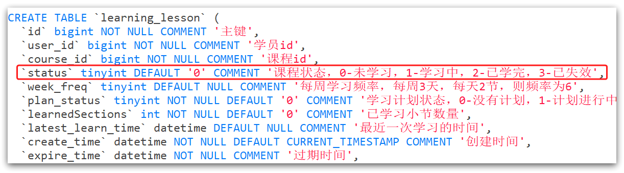status tinyint DEFAULT '0' COMMENT '课程状态,0-未学习,1-学习中,2-已学完,3-已失效',