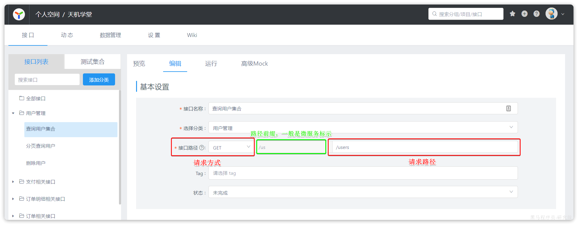 在这里要填写的是某个接口的基本信息,例如接口名字、分类(或者叫分组)、状态等。但其中最重要的就是接口的路径。路径中需要填写的核心有两部分:
