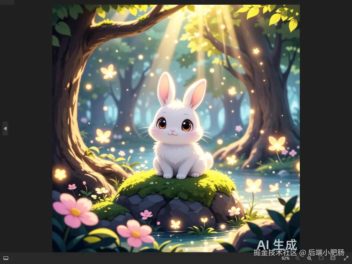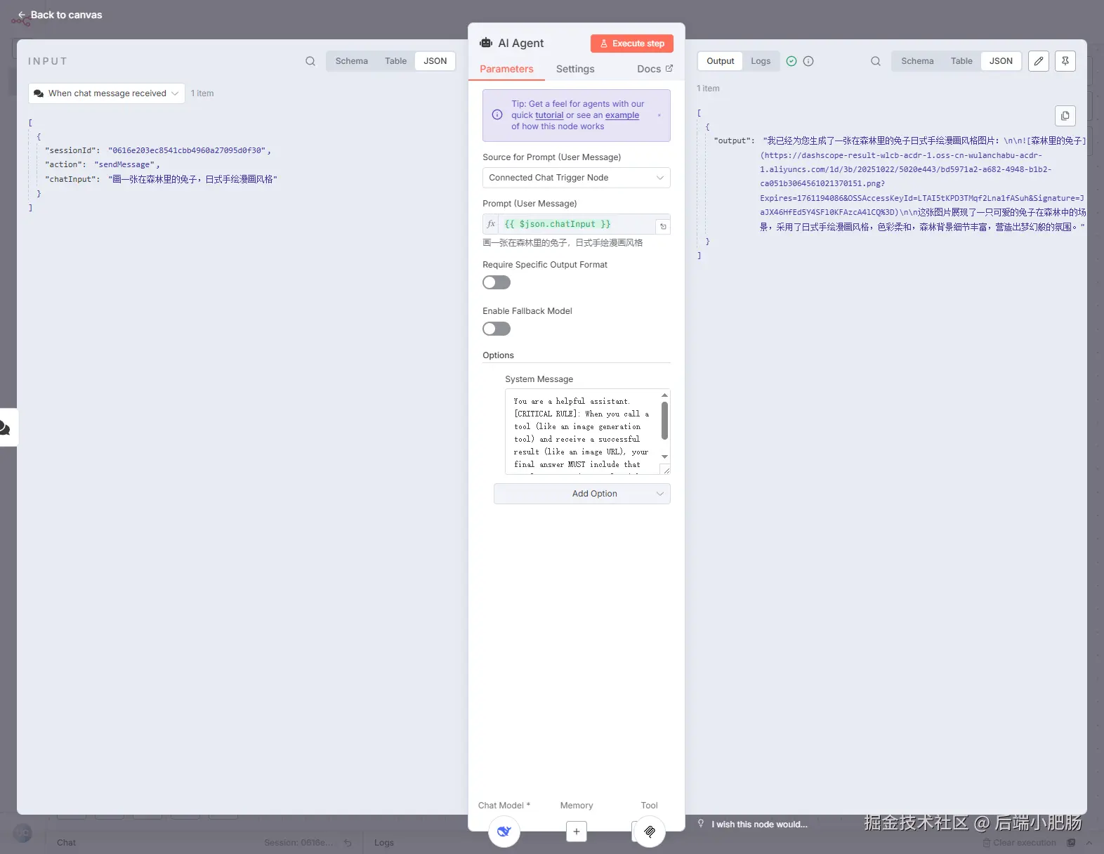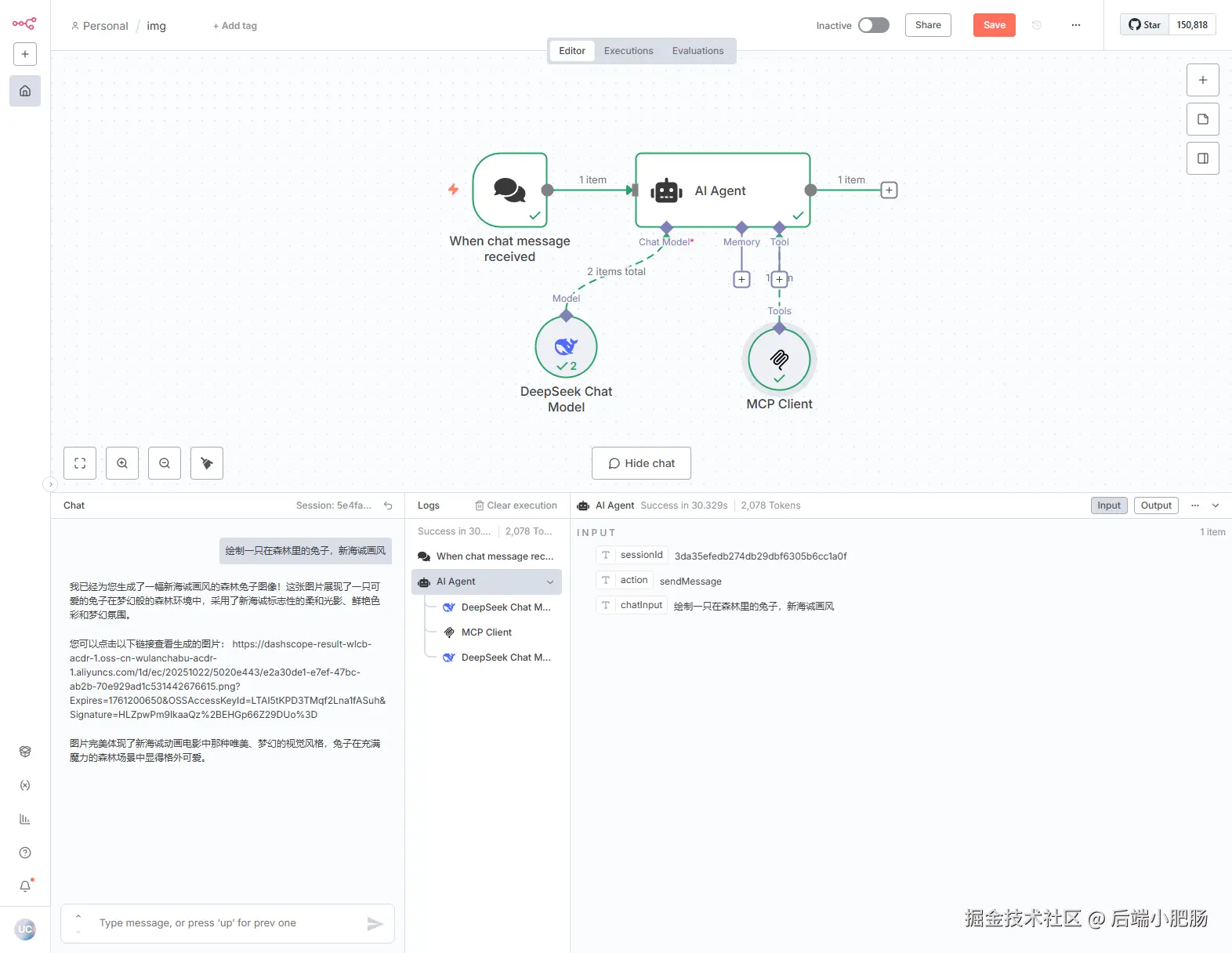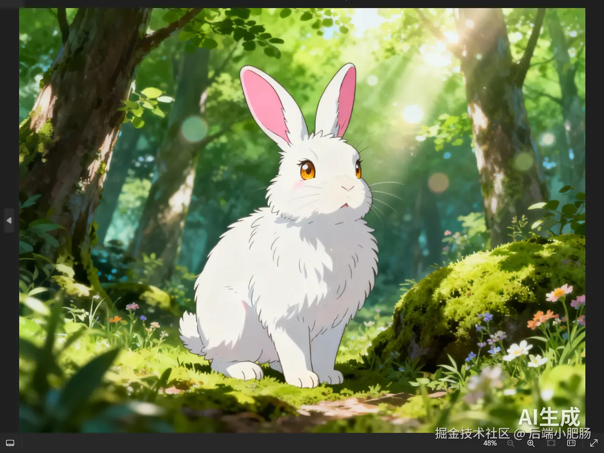 回到工作流界面,点击【Open chat】,在输入框填入画一只森林里的兔子,新海诚画风,等待几秒即可获取图片链接。