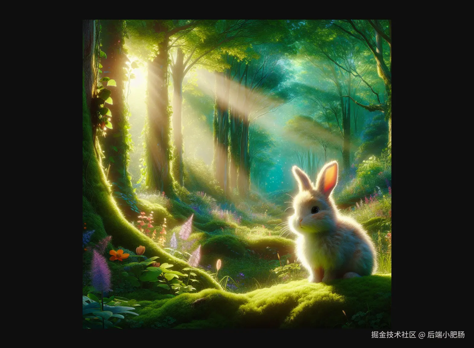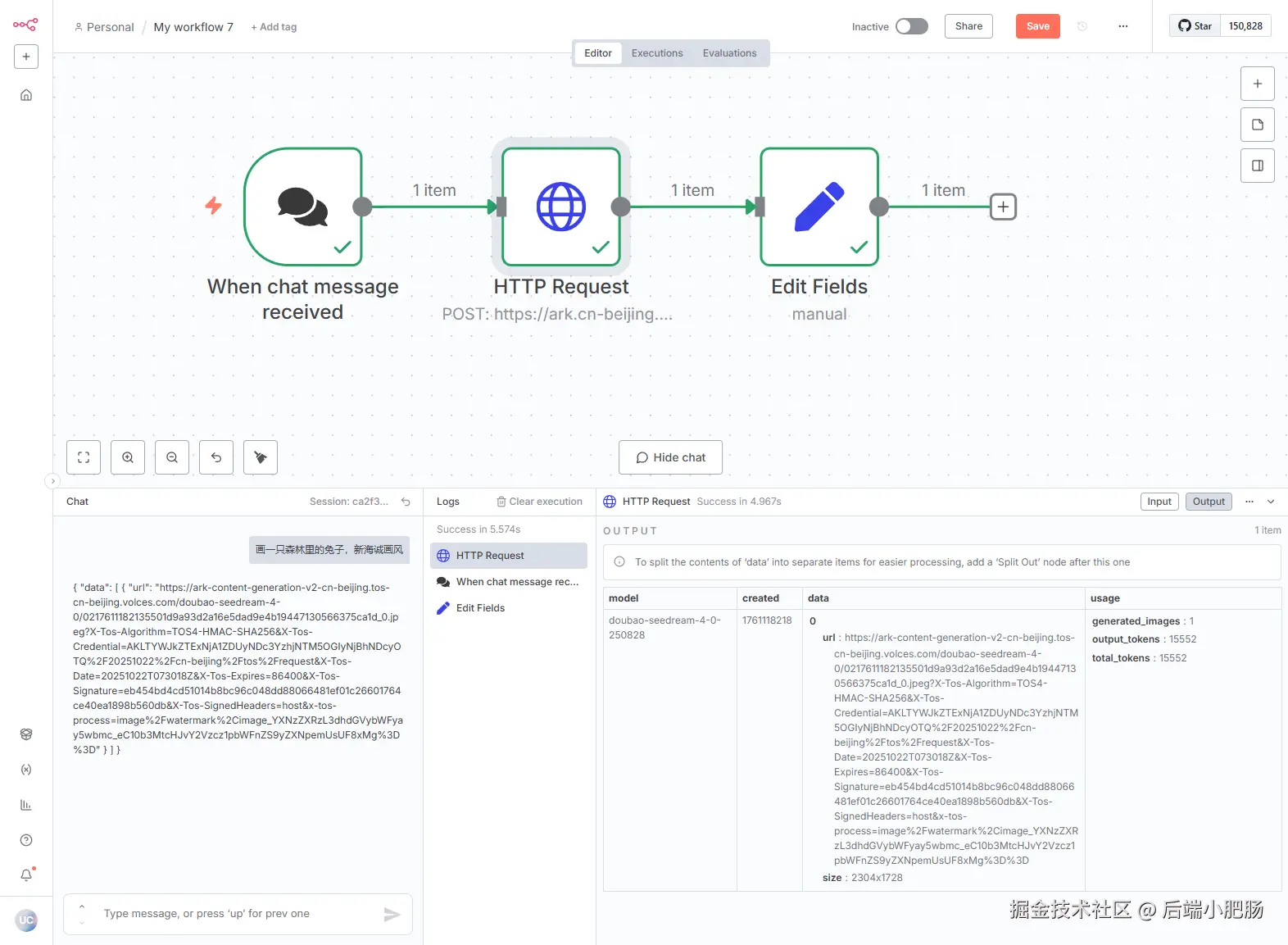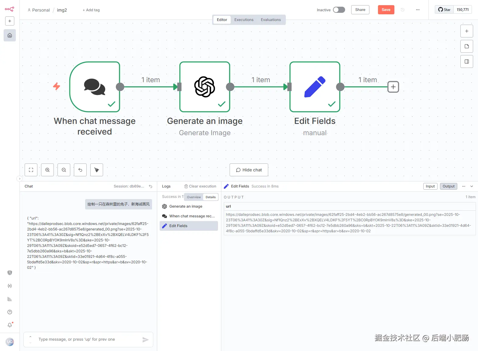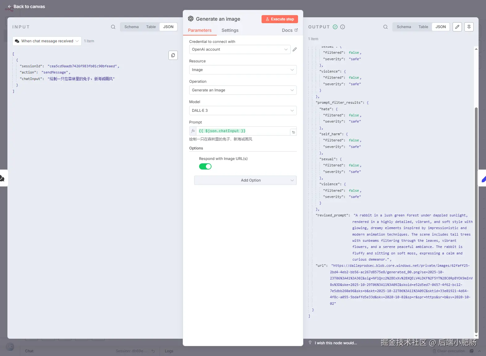 回到工作流界面,点击【Open chat】,在输入框填入画一只森林里的兔子,新海诚画风,等待几秒即可获取图片链接。