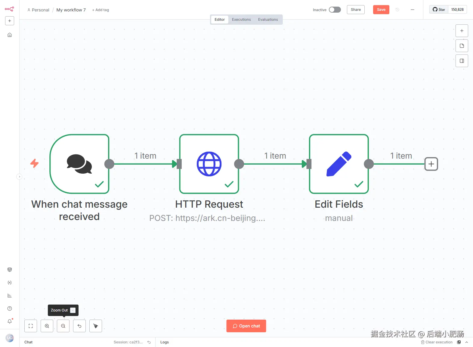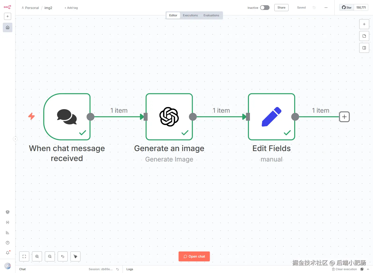 回到主工作流界面,点击【Open chat】,在消息输入框输入"绘制一只在森林里的兔子,新海诚画风",等待几分钟就可以看到结果。