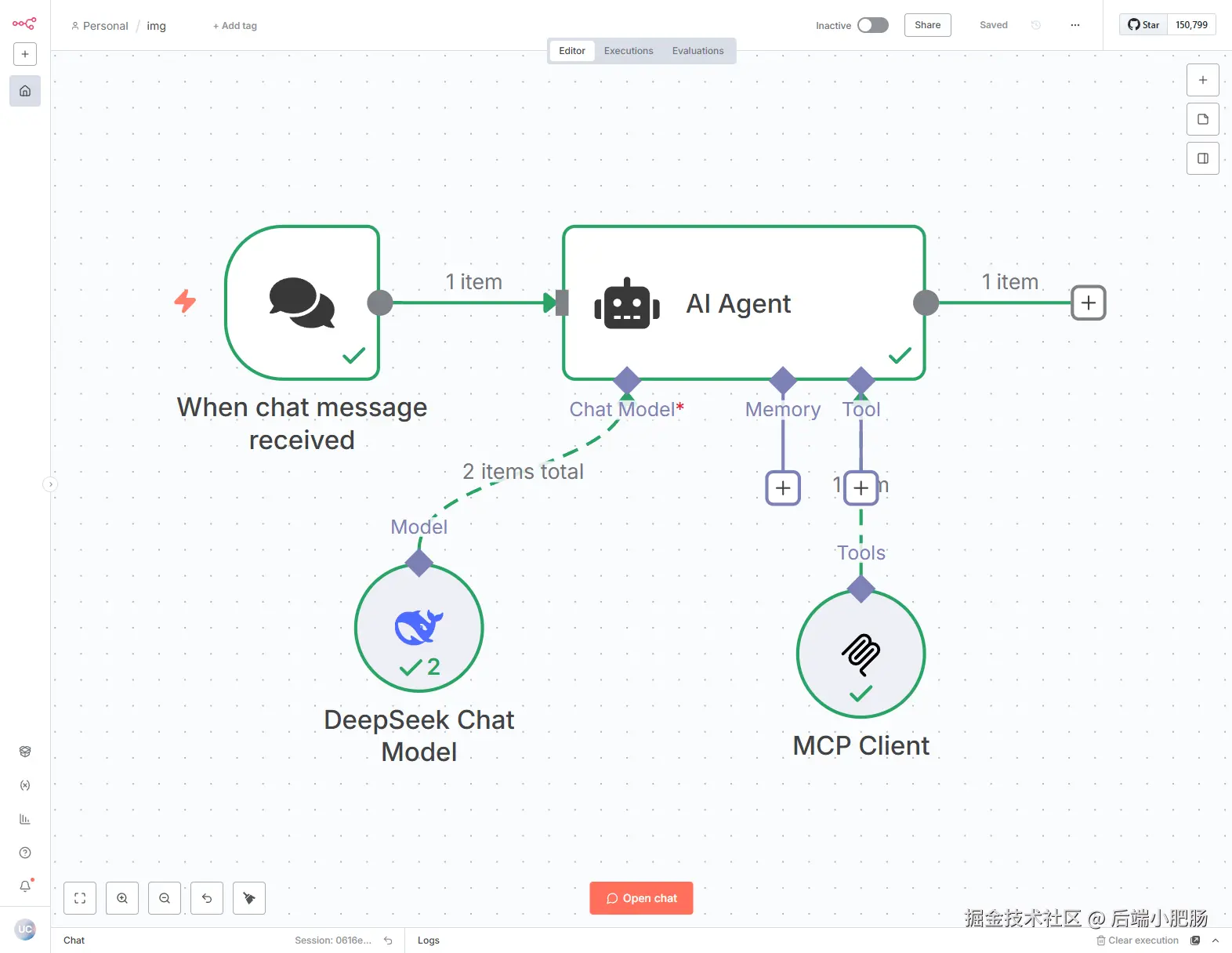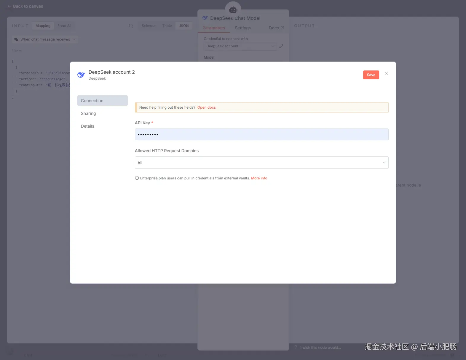 AI Agent---Chat Model配置: 在Chat Model处点击【+】配置大模型,选择DeepSeek Chat Model,在