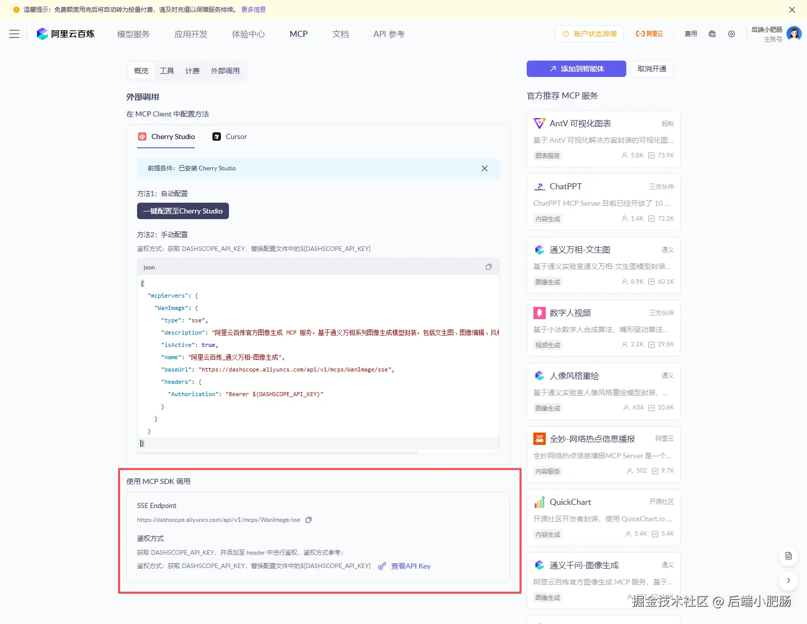 在这里我选择对接阿里云百炼官方图像生成 MCP 服务bailian.console.aliyun.com/?spm=a2c4g.... MCP SDK 调用,** 将SSE Endpoint配置到n8n MCP Client Tool节点中的Endpoint。
