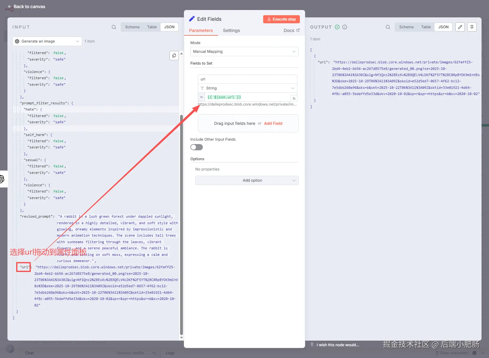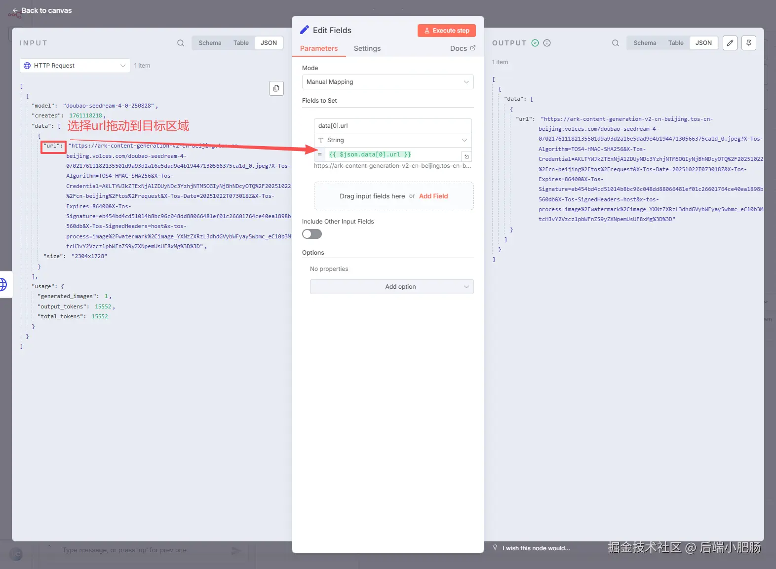 Edit Fields: Generate an image节点后接Edit Fields节点,将Generate an image节点的url拖动到属性面板。