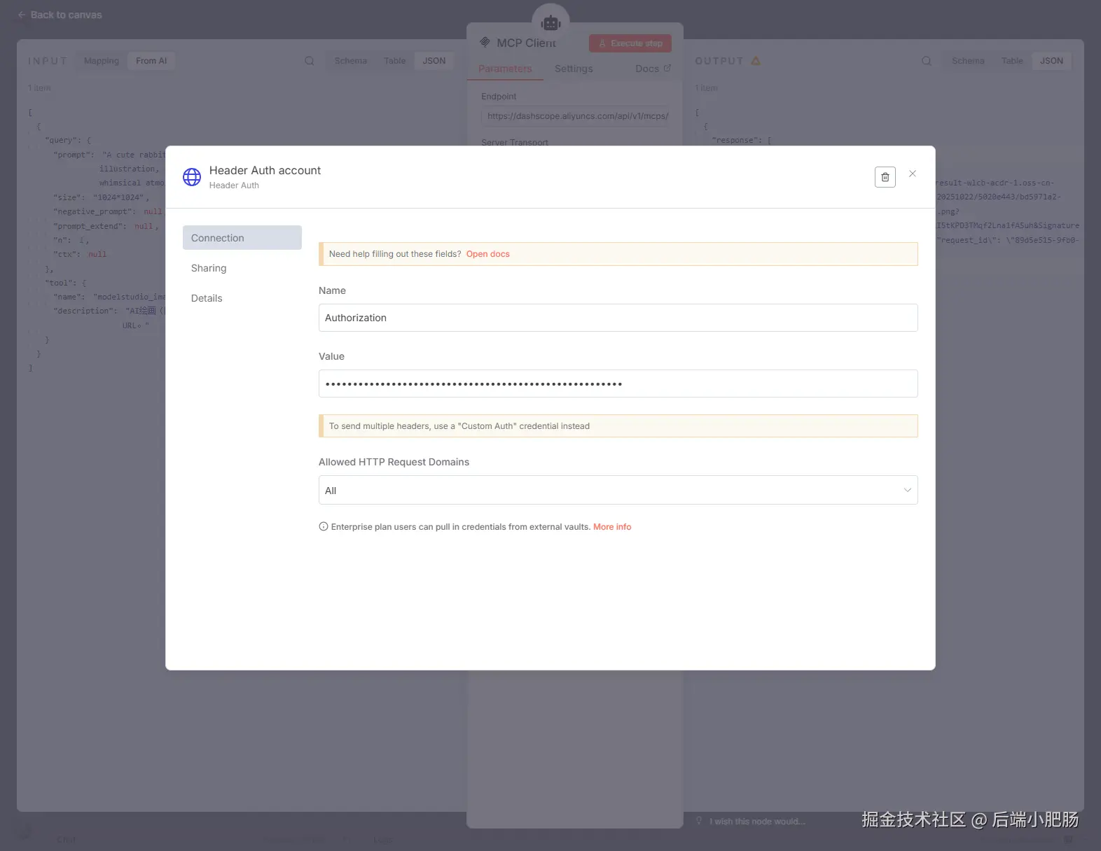 回到n8n MCP Client Tool节点,在Credential for Header Auth点击【Create new credential】,Name设置为Authorization,Value项则将百炼模型的key设置进去即可。