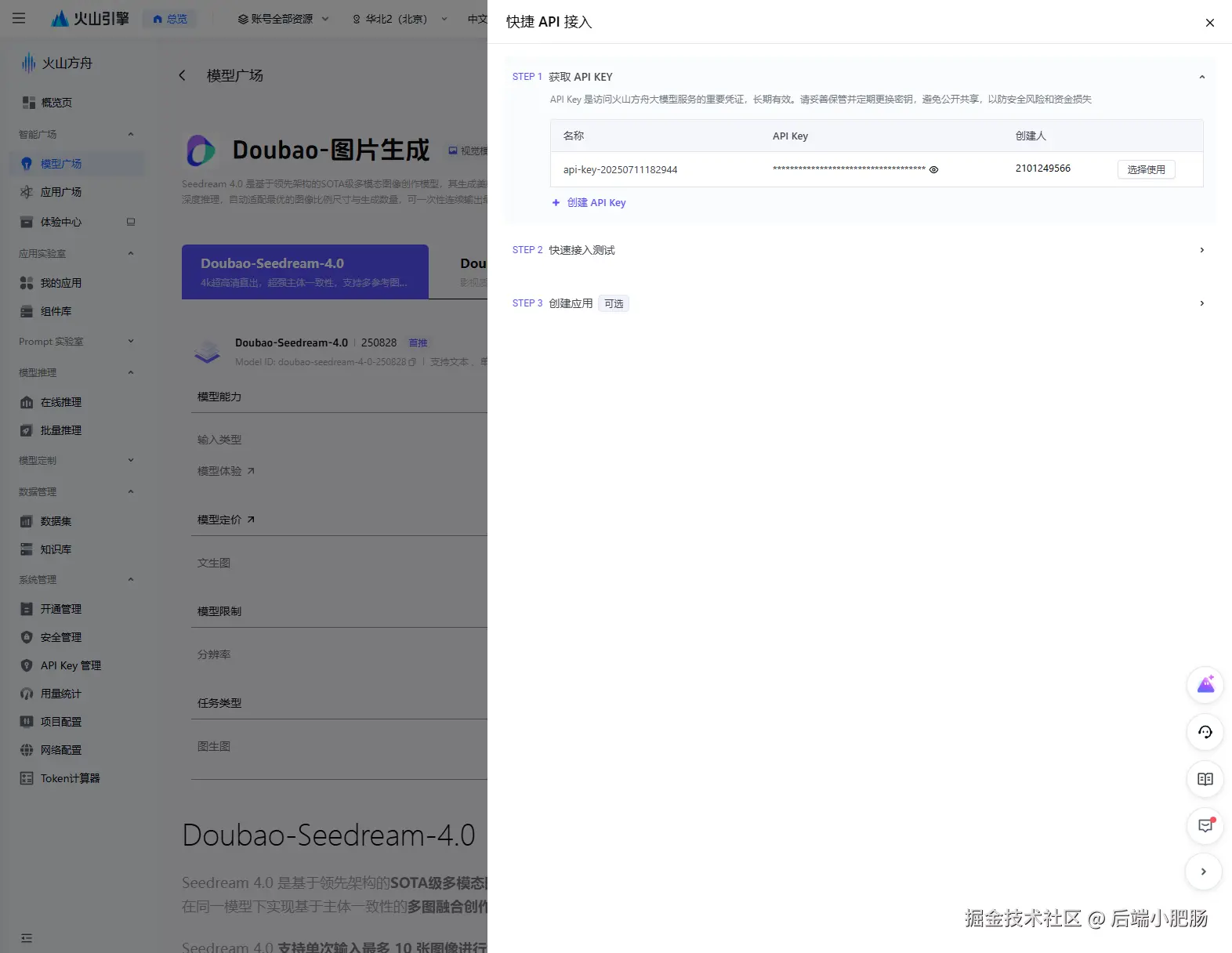 Seedream 4.0的 API KEY获取: 进入console.volcengine.com/ark/region:... API KEY项复制key,在key前面加Bearer和英文空格,形如Bearer 666才是要填入n8n中的API KEY。