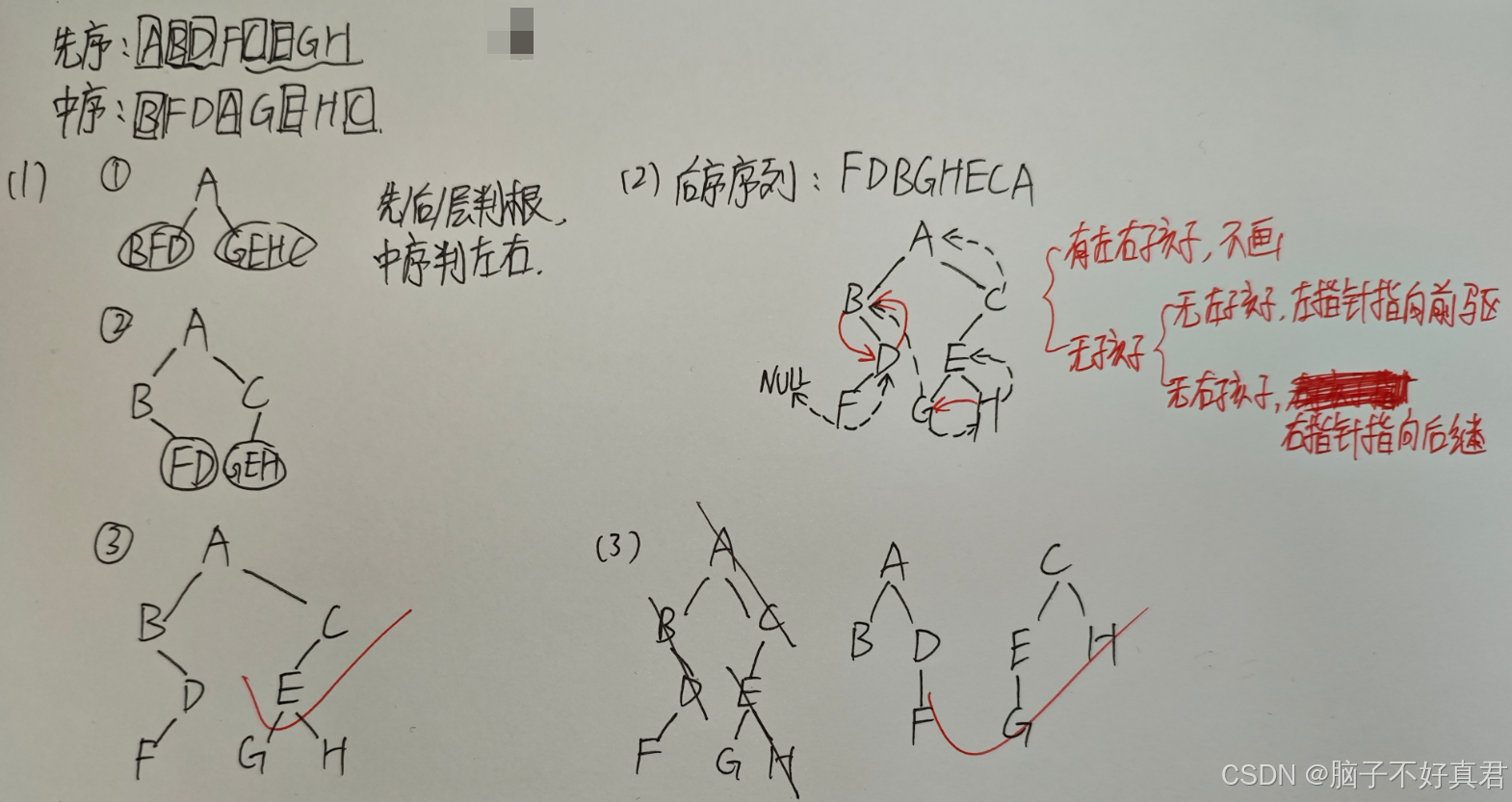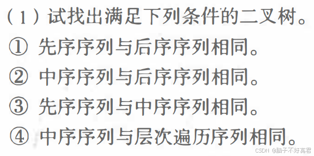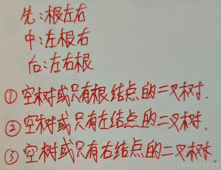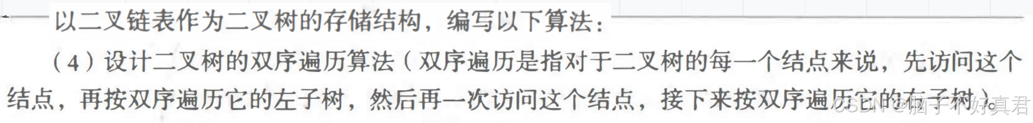 cpp// 双序遍历函数 void DoubleTraverse(BiTree T) { if (T == NULL) { return; // 空树,直接返回 } if (T->lchild == NULL && T->rchild == NULL) { printf("%c ", T->data); // 叶子结点,只输出一次 } else { printf("%c ", T->data); // 第一次访问根结点 DoubleTraverse(T->lchild); // 双序遍历左子树 printf("%c ", T->data); // 第二次访问根结点 DoubleTraverse(T->rchild); // 双序遍历右子树 } }