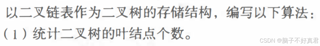 cppint LeafNodeCount(BiTree T) { if (T == NULL) return 0; // 空树,叶子结点数为0 else if (T->lchild == NULL && T->rchild == NULL) return 1; // 是叶子结点 else return LeafNodeCount(T->lchild) + LeafNodeCount(T->rchild); }