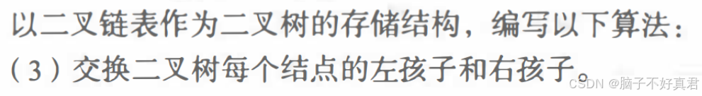 cppvoid ChangeLR(BiTree &T) { BiTree temp; if (T == NULL) return; // 空树直接返回 if (T->lchild == NULL && T->rchild == NULL) return; // 叶子结点无需交换 // 交换左右孩子 temp = T->lchild; T->lchild = T->rchild; T->rchild = temp; // 递归处理左右子树 ChangeLR(T->lchild); ChangeLR(T->rchild); }