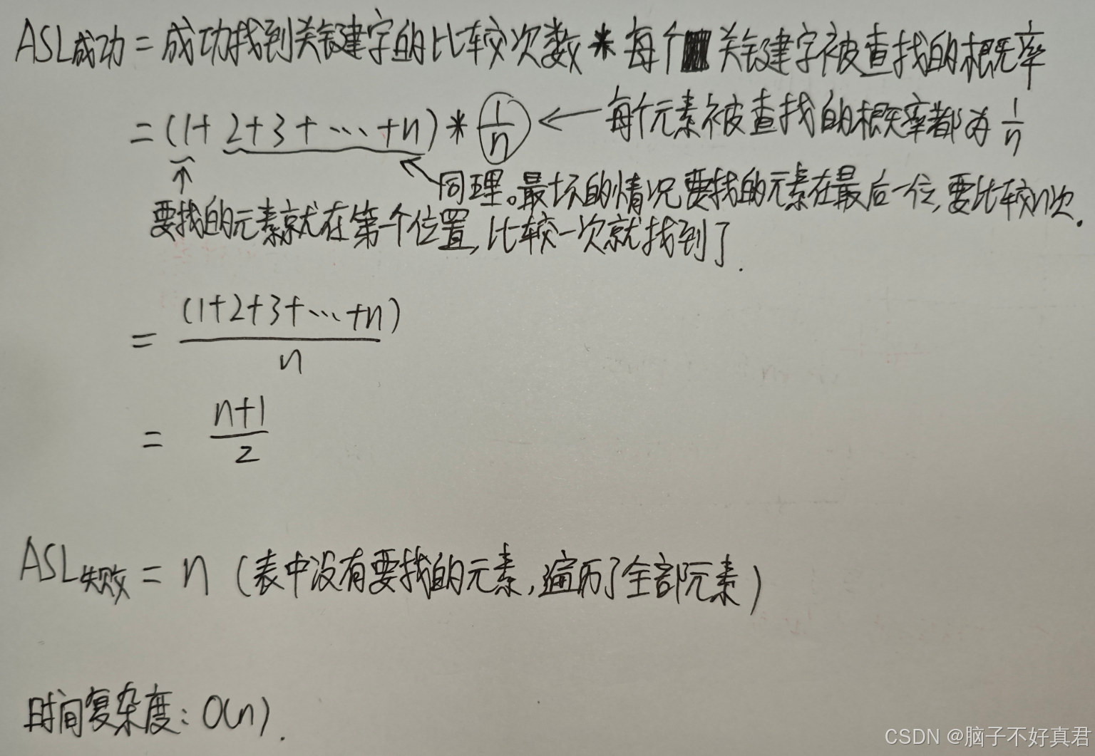 cppint SequentialSearch(int arr[], int n, int target) { for (int i = 0; i < n; i++) { if (arr[i] == target) { return i; // 返回目标元素的索引 } } return -1; // 未找到 }ASL分析