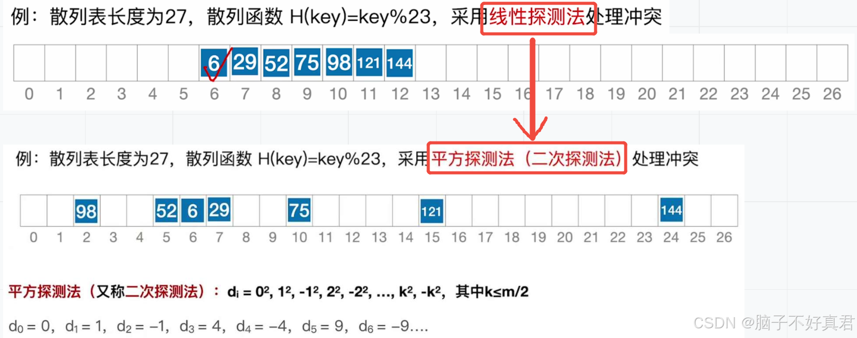 线性探测法在发生冲突时,总是往后探测相邻的后一个单元,很容易造成同义词、非同义词的"聚集(堆积)现象",从而影响查找效率,导致ASL提升