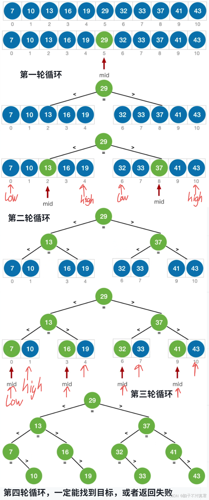 ⑤重复上述过程,直到找到目标或查找范围为空。