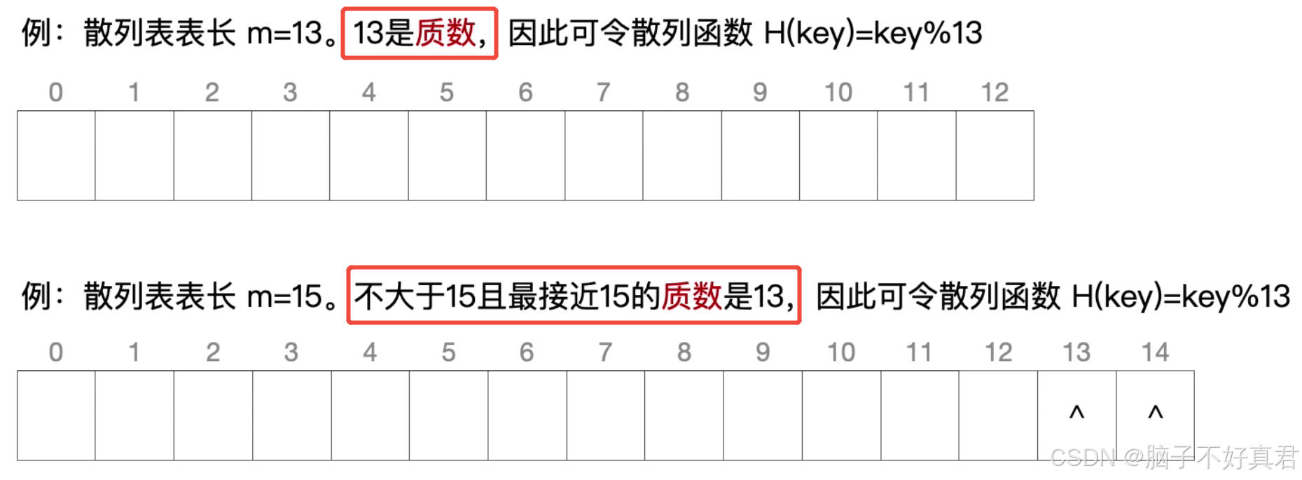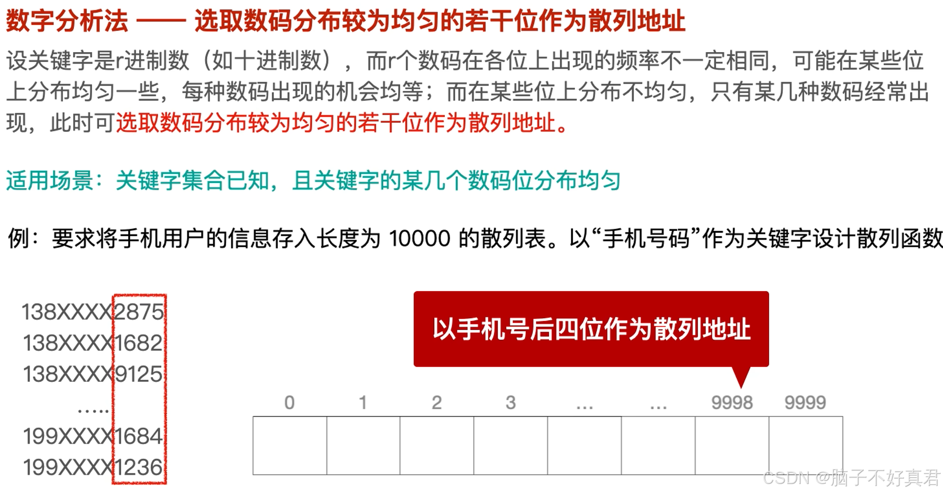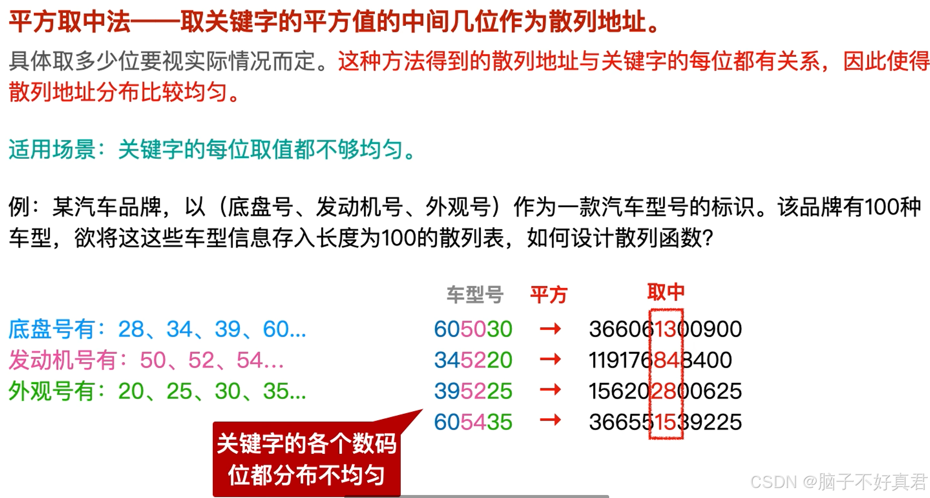 p的选取:散列表表长为m,取一个不大于m但最接近或等于m的质数p,因为对质数取余,可以分布更均匀,从而减少冲突。适用场景:较为通用,只要关键字是整数即可