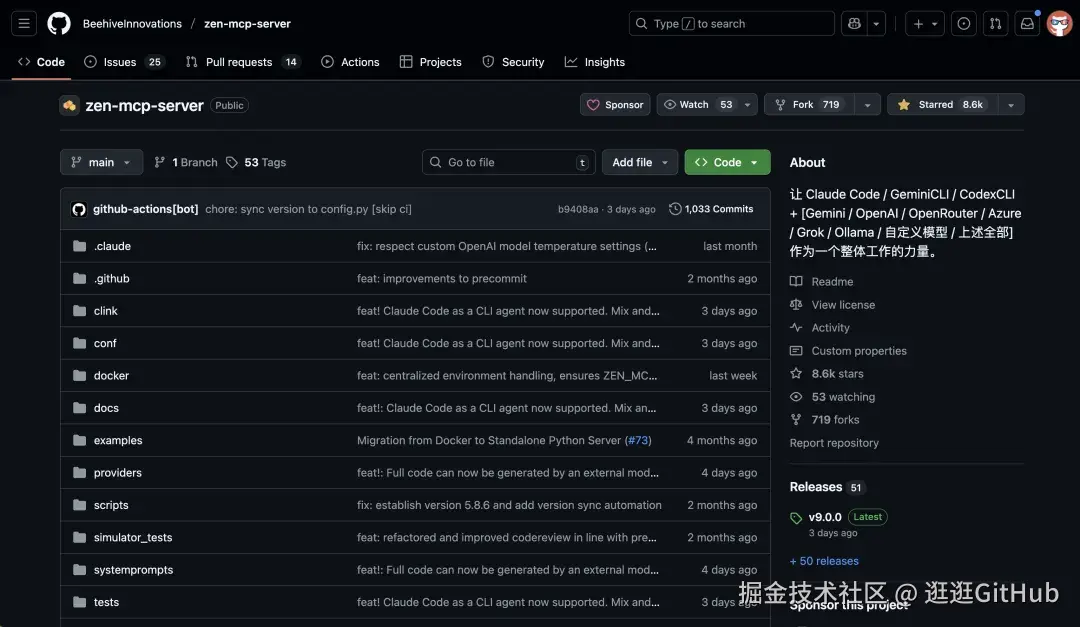 这个叫做 zen-mcp-server 的开源项目登上了当日 GitHub 开源热榜。现在已经在 GitHub 上获得 8.6K 的 Star 了。