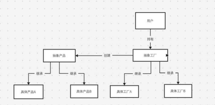 相较于简单工厂 ,工厂方法 多设计了一层抽象的工厂类,并为每一个产品创建了对应的工厂,从而遵守了开闭原则 (在进行扩展的时候,只需要创建一个新的产品类与产品工厂,而不需要修改已有的产品或工厂)。此外,我们将使用者单独抽出来,使用者User