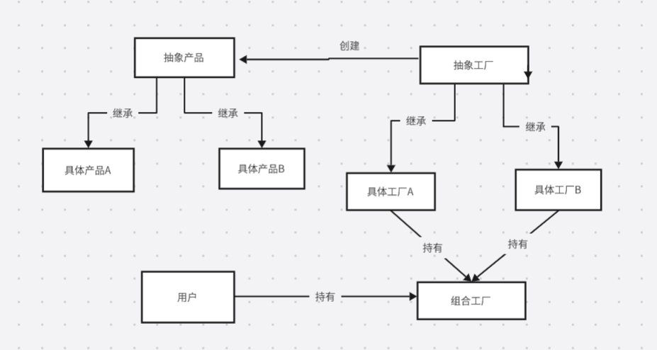抽象工厂 在代码的实现层面相较于工厂方法将会提供一个整体工厂(合并了组件工厂),其余的部分无差异。