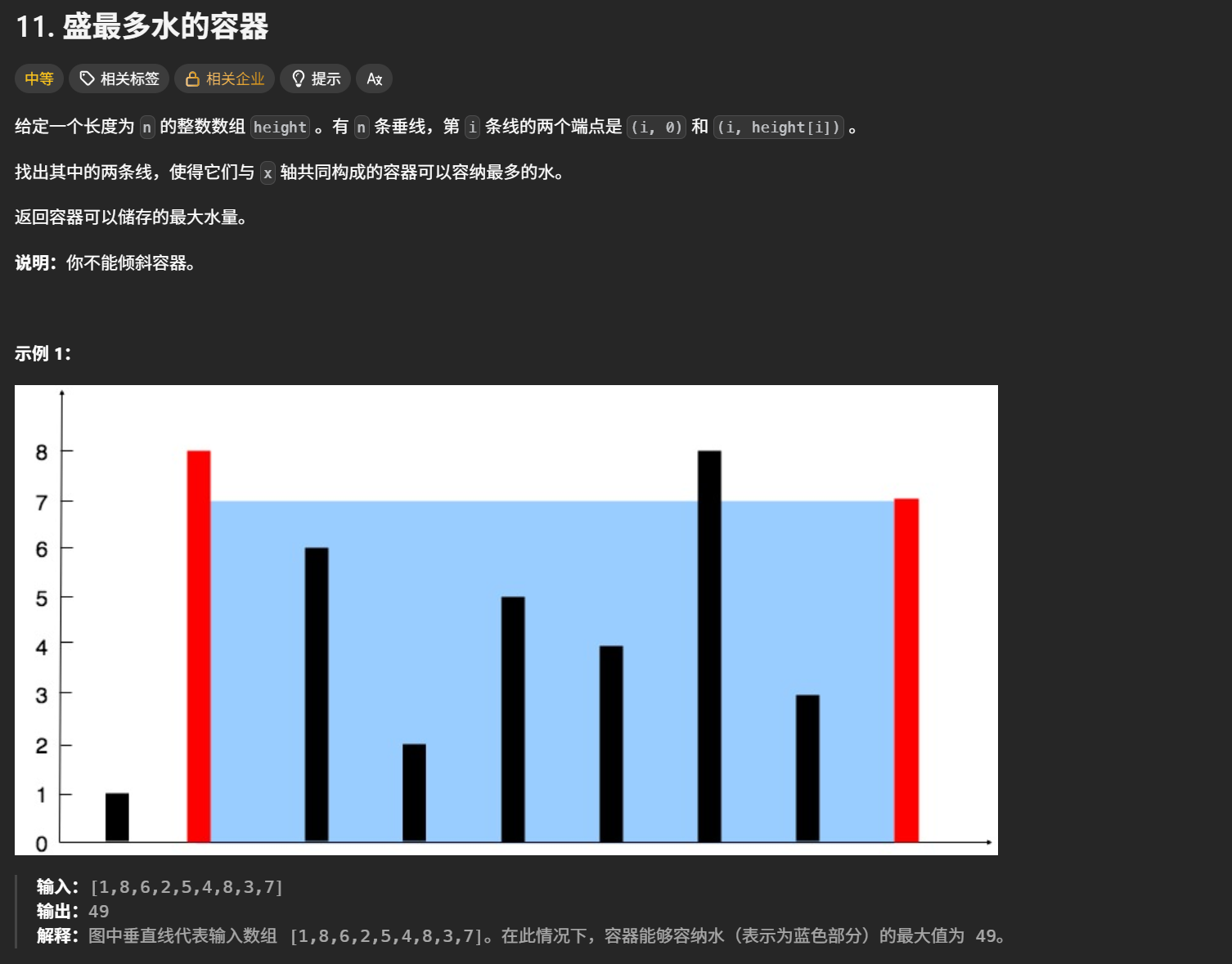 - 4、[盛最多水的容器](https://leetcode.cn/problems/container-with-most-water/description/?envType=problem-list-v2&envId=v69rxJf0)