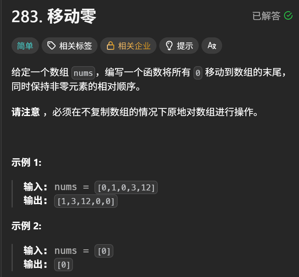 - 1、[移动零](https://leetcode.cn/problems/move-zeroes/description/?envType=problem-list-v2&envId=v69rxJf0)